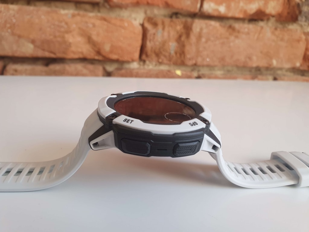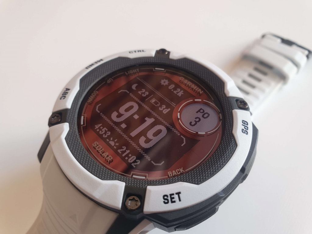 Az óra nagyobb méretei és robusztus kialakítása arra utal, hogy elsősorban szabadtéri tevékenységekre és a természetben való mozgásra szánták. A kijelző kerületén látható csavarok tisztességes megjelenést és taktikai jelleget kölcsönöznek az órának. Ez egy olyan dizájnelem, amellyel a kisebb Garmin Instinct 2 órákon nem találkozhatunk. A kijelző műanyag lünettája jelentősen túlnyúlik az üvegen, ami növeli a tartósságot. Az üveg és a lünetta közötti átmenet azonban nagyon könnyen befogja a port és a szennyeződéseket.